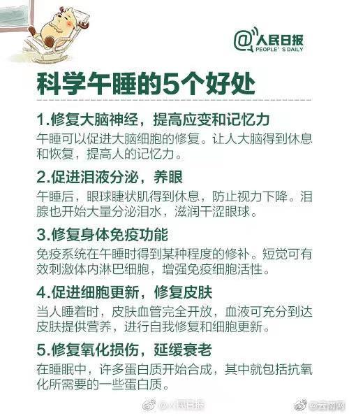 科学午睡这样做:①睡前不吃油腻食物;②睡时枕上枕头;③姿势:以平躺仰卧或侧卧为佳;④时间:半小时左右为宜;⑤醒后轻度活动:慢慢站起,喝一杯水;⑥避免空调或电扇直吹身体;⑦不要坐着或趴着打盹。