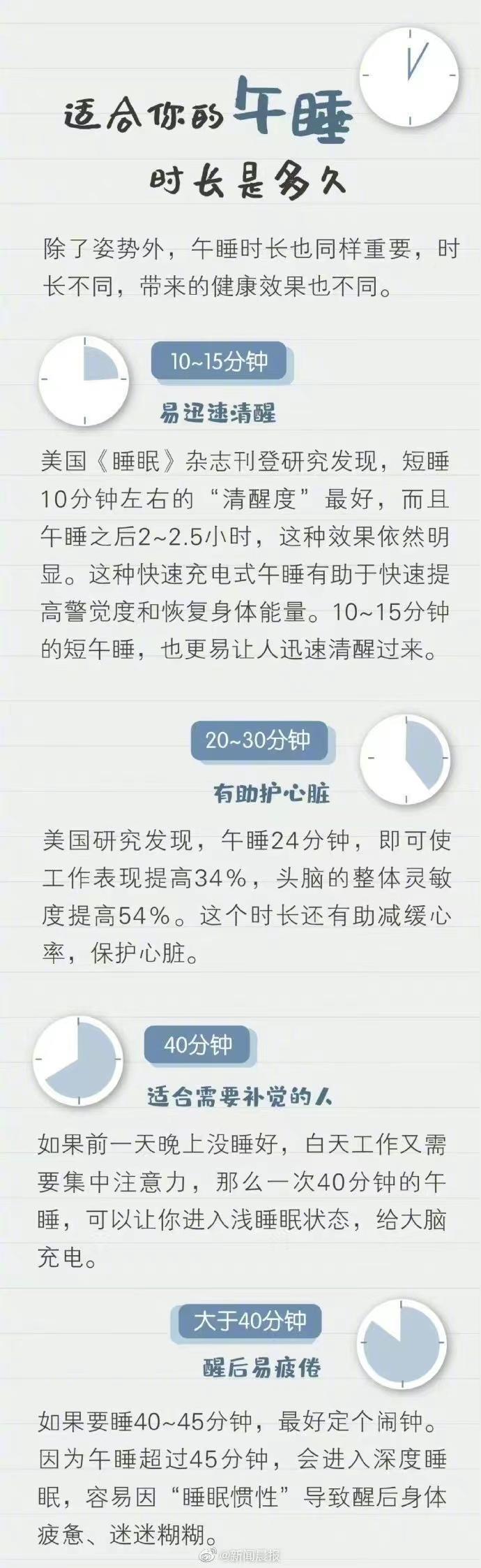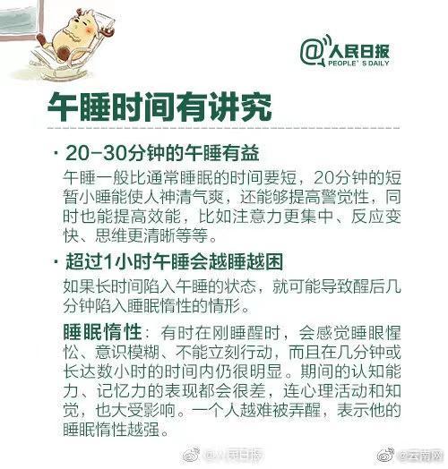 你有过这种经历吗?午觉醒来后,反而比睡之前更累。解决这个问题的方法,就是缩短午睡时间。千万别睡觉时间高于30分钟,容易陷入睡眠惯性,所谓,睡眠惰性就是人刚从深睡眠中醒来出现暂时性的低警觉性、行为紊乱、认知能力下降的状态,也就是越睡越累、越睡心情越不好。午睡超过45分钟,身体会进入深度睡眠,反而容易因“睡眠惯性”导致醒来后疲惫、迷迷糊糊。