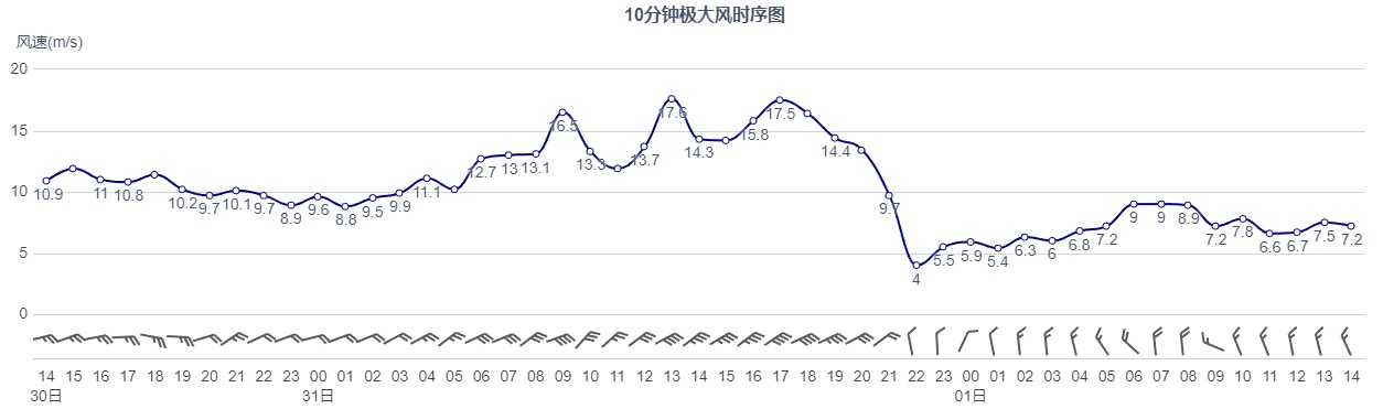 青岛市南大公岛7月30日至8月1日阵风(极大风)变化