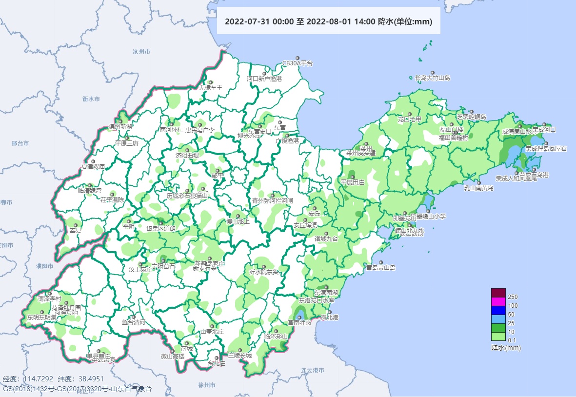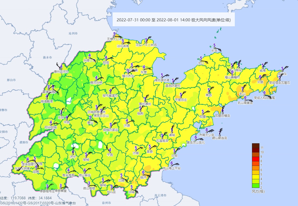 受“桑达”影响,7月31日00时至8月1日14时,威海、烟台、青岛和日照出现小到中雨局部大雨,荣成石岛港降水量最大为48.8毫米;黄海中部和北部海域出现东北风,近海观测站阵风达6—8级,其中青岛市南大公岛阵风最大为8级(17.6米/秒),出现在31日13时。