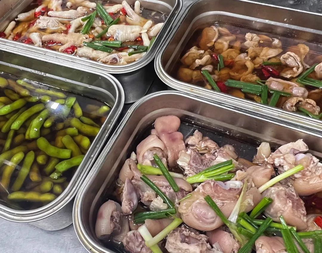 王泽锋是土生土长的南翔人,对美食有着独特见解。在他小时候,奶奶隔三差五就给他做糟货,有糟鸡爪、糟鸭、糟鹅、糟带鱼、糟猪蹄、糟门腔、糟毛豆等,最拿手的就是糟鸡。越鸡配上八角、桂皮等十种香料,鸡煮熟冷藏后浸入调好的糟卤中静置一段时间再食用,一家人每每吃得意犹未尽。