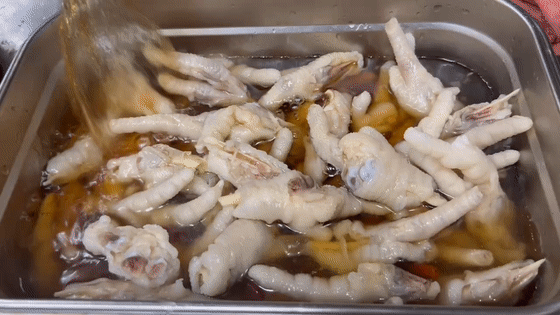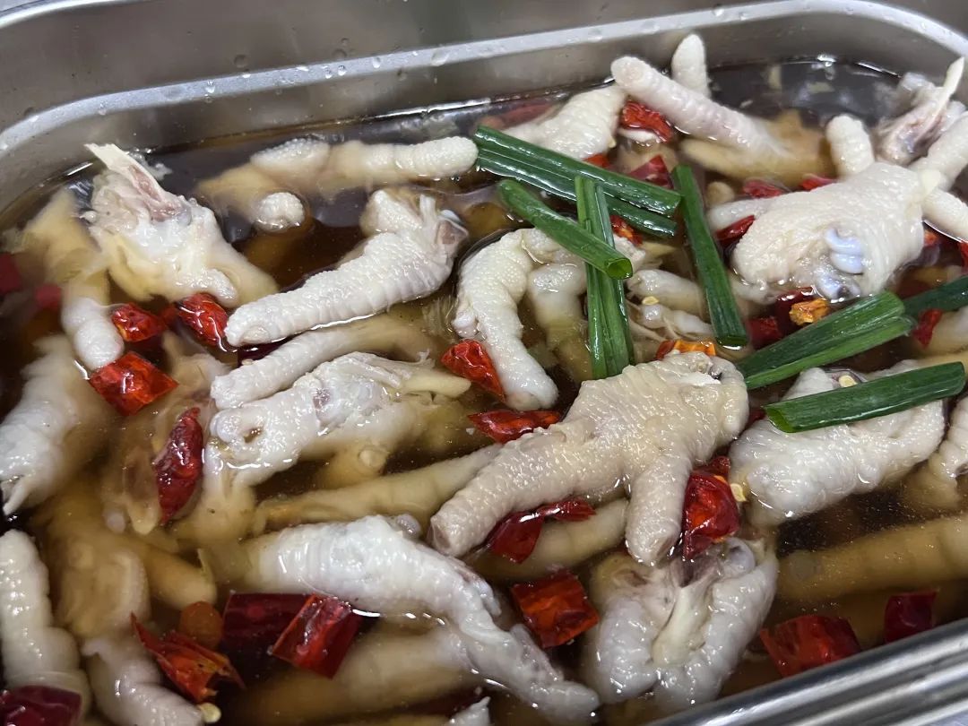 鸡爪洗净,将鸡爪的指甲剪掉,再从中间剪开一分为二方便入味。锅中加清水,料酒和生姜片煮沸焯水,捞出洗净血水。重新将鸡爪放入锅中再次煮沸,中火焖煮10分钟左右,捞出过凉水,将卤汁浸泡盖过鸡爪,放入冰箱冷藏2-3小时。
