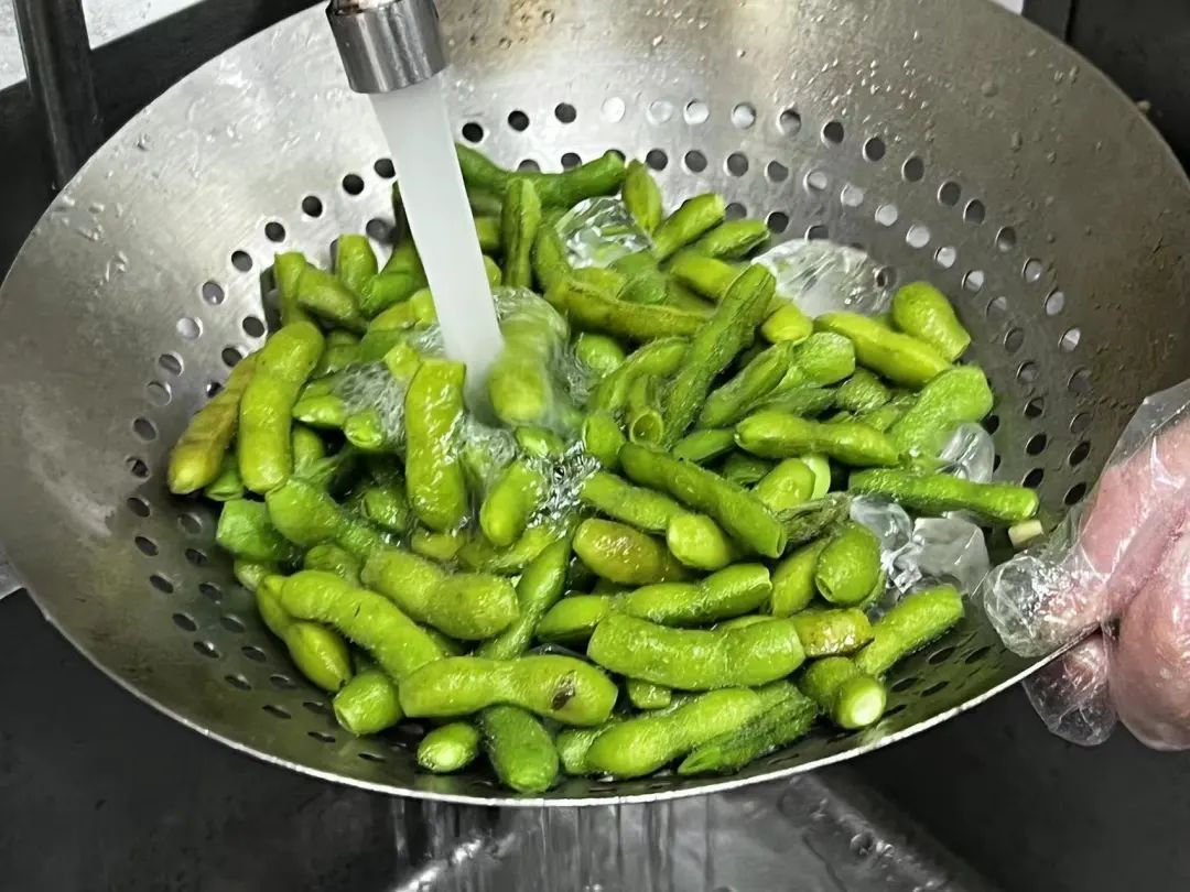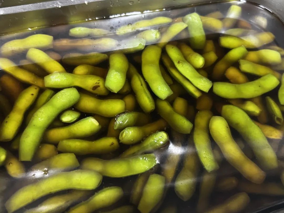 将新鲜的毛豆两头剪去,卤制时更易入味。将毛豆放入水中煮5分钟左右,捞出后过凉水,再将卤汁浸泡盖过毛豆,放入冰箱冷藏2-3小时。