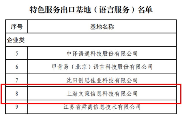日前,商务部等7部门公布了人力资源、知识产权、地理信息和语言服务等4个领域的专业类特色服务出口基地名单,位于虹口区的上海文策信息科技有限公司入选。
