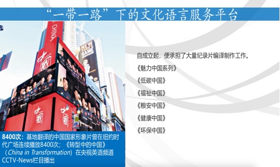 三是搭建公共服务平台,推动文化“走出去”。基地搭建文化语言服务平台,承担文化“走出去”项目,参与《鸟瞰中国》等享誉海内外的大型纪录片十余部。同时,通过在海外建立的高校、文化机构与媒体渠道,助力国家文化产品在东南亚、中东等“一带一路”沿线国家广泛宣传、出版及放映。