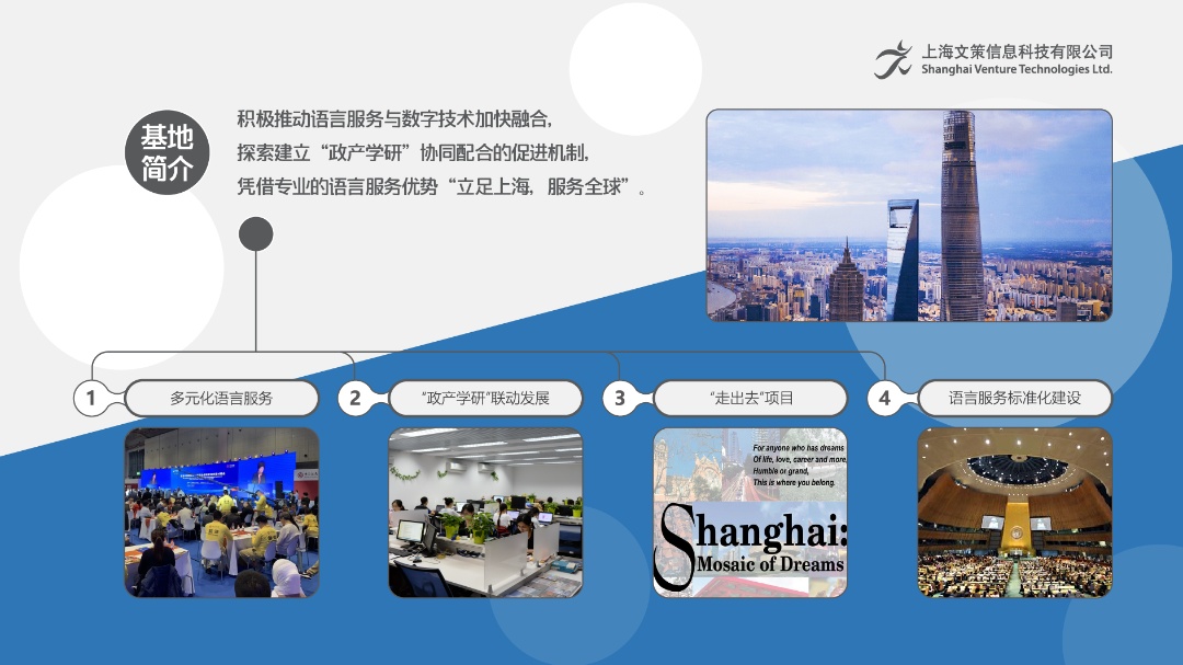 上海文策信息科技有限公司成立于2016年,是国内知名的语言服务提供企业,致力于打造全方位专业语言服务平台,下属三家全资子公司,包括上海文策翻译有限公司、上海梦织地创意发展有限公司及浙江文策文化发展有限公司,并在广州、武汉、重庆等全国13个中心城市设有分公司和办事处。在海外,设有英国伦敦办事处,在英国国际贸易部、伦敦发展署等海外政府机构的大力支持下快速发展。