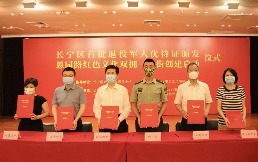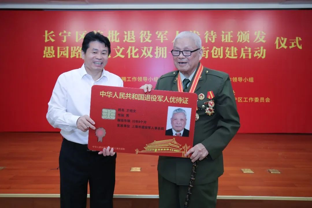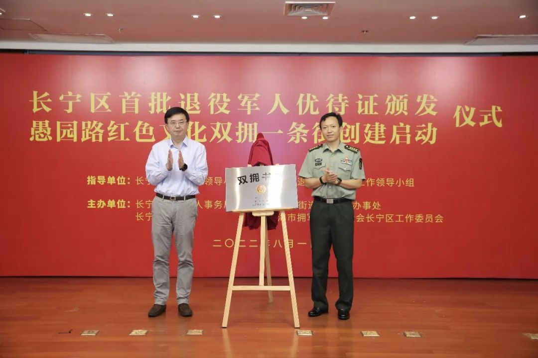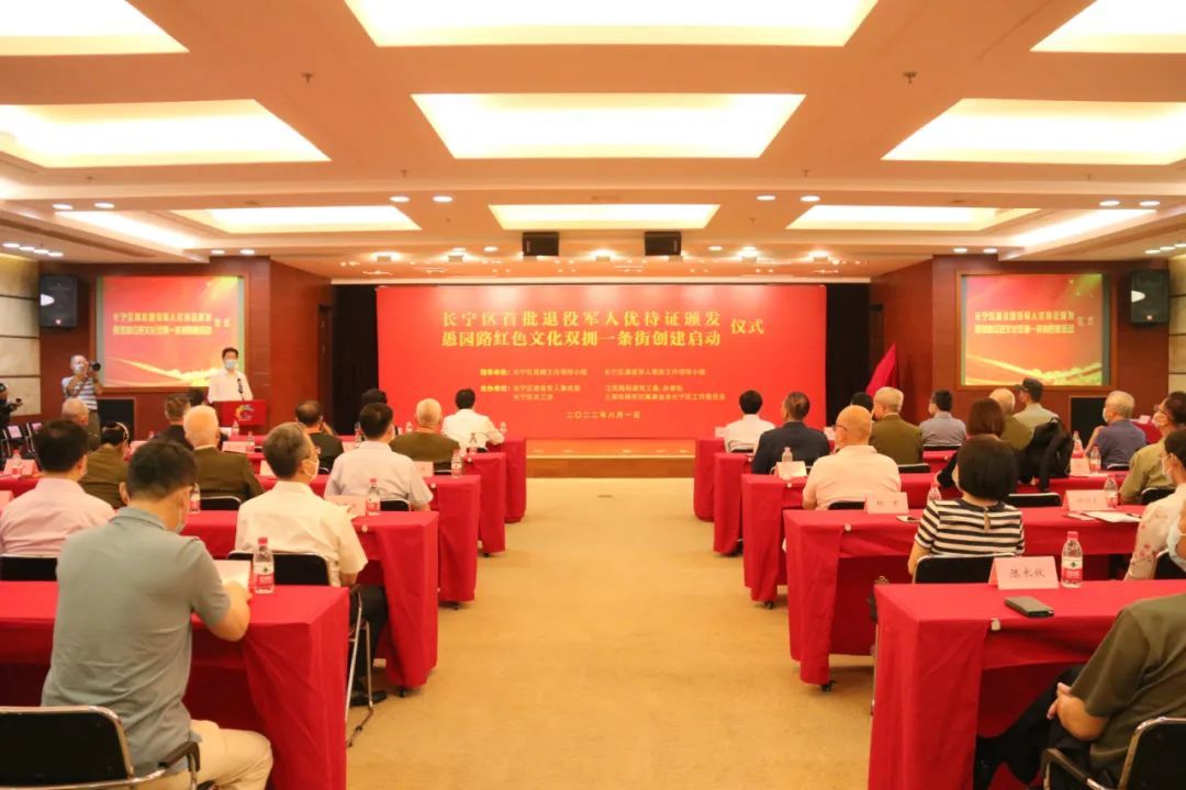 今天(8月1日)上午,长宁区首批退役军人优待证颁发暨愚园路红色文化双拥一条街创建启动仪式在区工人文化宫举行。区委副书记、区退役军人事务工作领导小组组长纪晓鹏出席并致辞,副区长、区双拥工作领导小组副组长、区退役军人事务工作领导小组副组长陆浩,上海市拥军优属基金会长宁区工作委员会会长刘英出席。