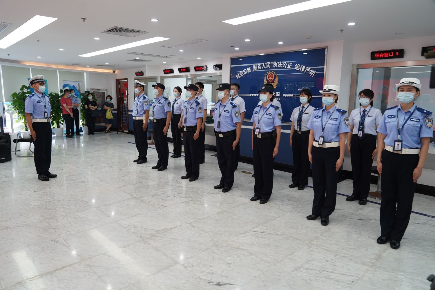 上午9点,在静安公安分局石门二路派出所大厅内,来自静安公安各条线岗位、一线部门的14名文职辅警和勤务辅警代表,在专管民警的带领下,整齐列队,伴随着庄严的国歌声响起,静安公安辅警集中“授证换标”上岗仪式开始,辅警们佩戴了新版号牌、胸徽和肩章,随后在岗位上开启工作。