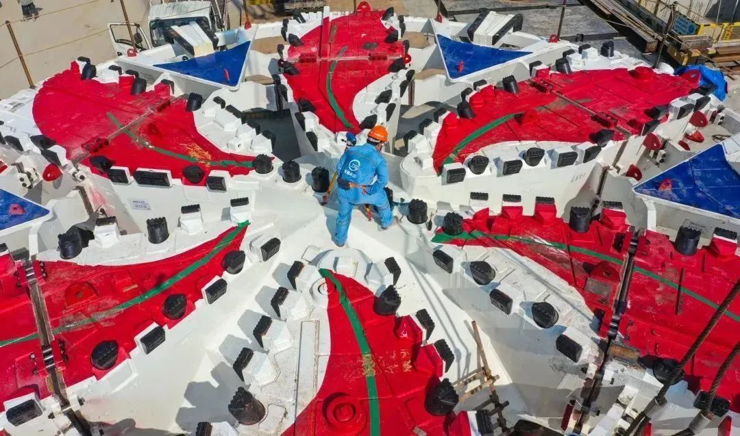 下一阶段,“申通号”即将施工的区间隧道全长约7.74公里,最大埋深达到34.3米,这将成为当前国内轨道交通一次性掘进距离最长的大直径泥水平衡盾构法隧道。“申通号”刀盘主造型是一朵绽放的红花,建设者说这象征着崇明岛鸟语花香的生态环境,蓝色箭头则象征轨道交通建设者聚势而上,为崇明发展献计献策。