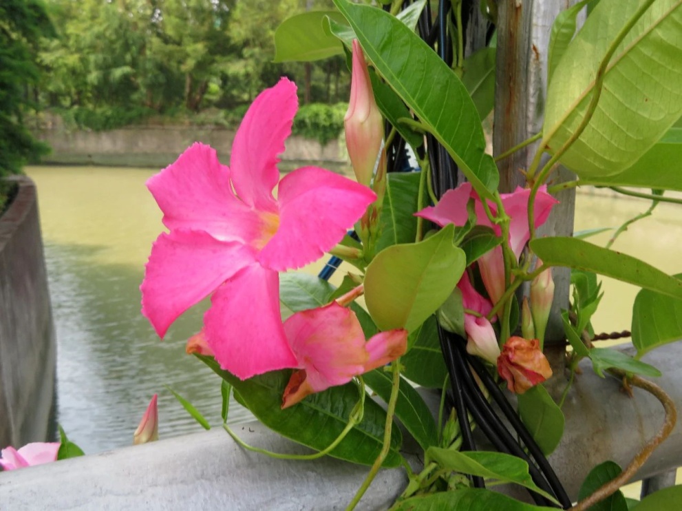 双喜藤是一种新型藤本植物,又称红皱藤、双腺藤、飘香藤、文藤、红蝉花,原产美洲热带,为夹竹桃科多年生常绿植物。双喜藤的缠绕茎柔软而有韧性,顺着支架盘旋而上,粉红似喇叭的花儿大而直挺,花径能达到6~8厘米。双喜藤喜温暖湿润及阳光充足的环境,也可置于稍荫蔽的环境中,不耐寒。