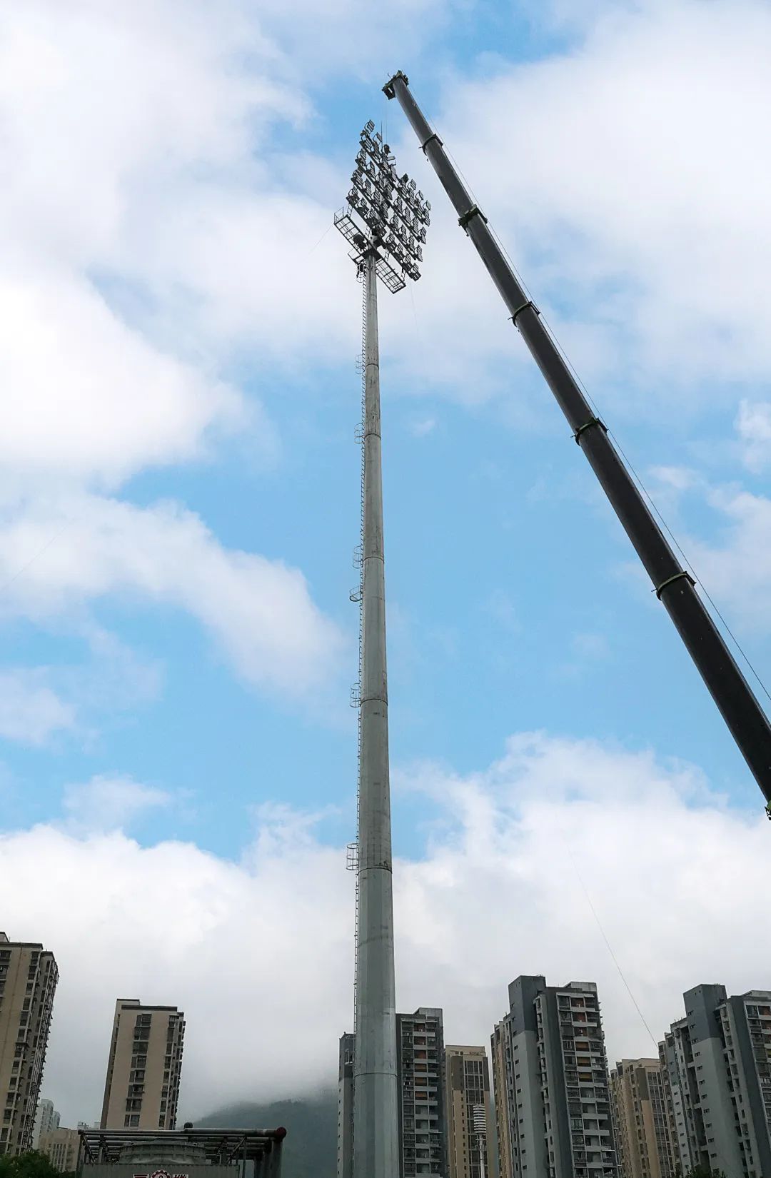 “国内高杆灯的极限高度一般为40米,国家跳台滑雪中心的65米高杆灯已经接近‘天花板’了,73.5米的高度对技术和工艺有很大的挑战,团队多次研讨并快速制定了科学合理的方案。”郑宏介绍,高杆灯杆顶的最大风速可达14级,为确保结构安全,维蒙特采用国内设计规范为主、国外规范为辅的方式进行杆身结构设计。杆体分为8节,套接连接,传力简单可靠,无螺栓免维护;杆底部直径2.05米,总重量52吨,仅一个底节就达到了12吨;在细节上升级了杆内的挂线系统,增加了更多的安全防护系统,以确保施工安全。