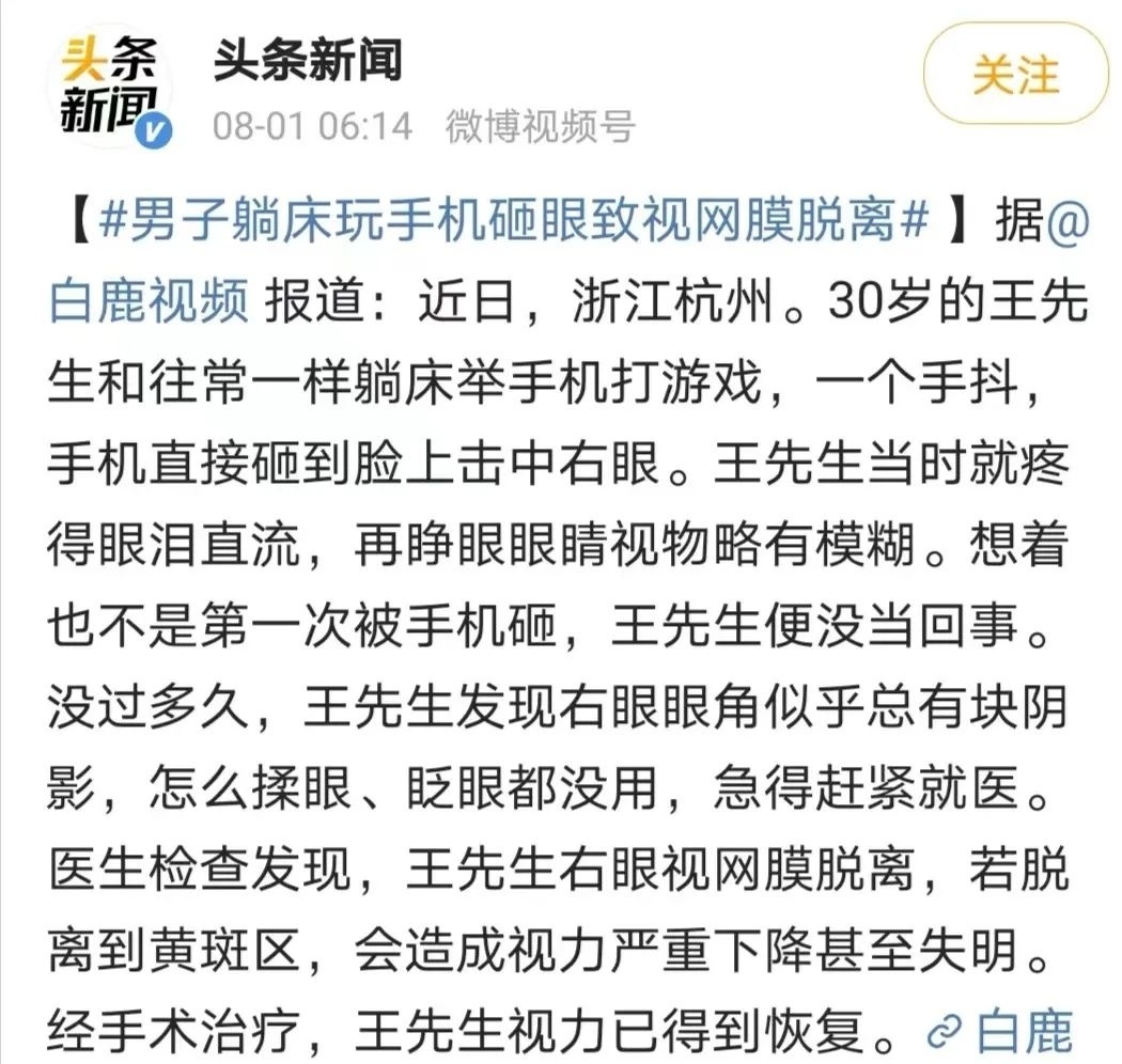 近日,一小伙躺着玩手机,不慎将手机掉落砸到眼睛导致视网膜脱离了。