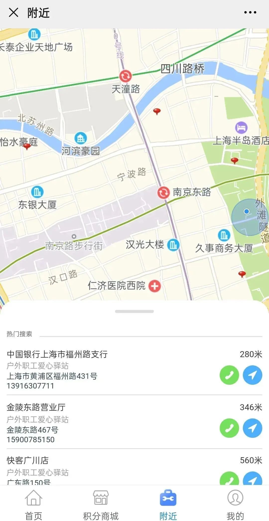 户外工作者们,可以通过进入申工社微信菜单栏“服务大厅”,点击下方“附近”;