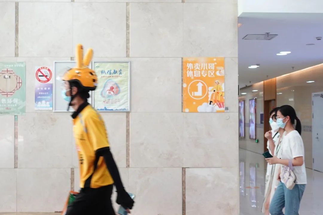 盈浦街道总工会联合吾悦广场一起,开设了一个“外卖小哥休息专区”。该区域门外有着醒目的海报,地上则贴有黄色的指引牌。有小哥反映休息点的手机信号不佳,工会牵头商场火速解决。