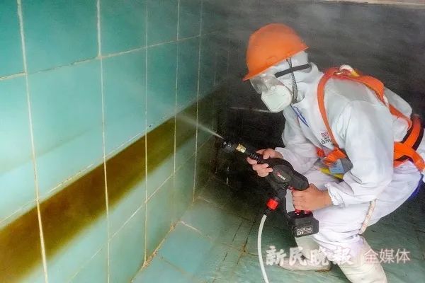 来不及休息,他们就把梯子从水箱顶部的洞口伸进去,然后小心而下。里面不通风,烈日炙烤下,如同一个蒸笼。消毒水一运进来,喷枪一开,就拉开了清洗架势。半小时不到,原本“长”着绿色物质的水箱壁又白洁如新了。