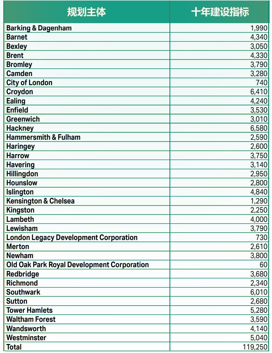 大伦敦各自治区十年内小于0.25公顷地块住房套数建成指标