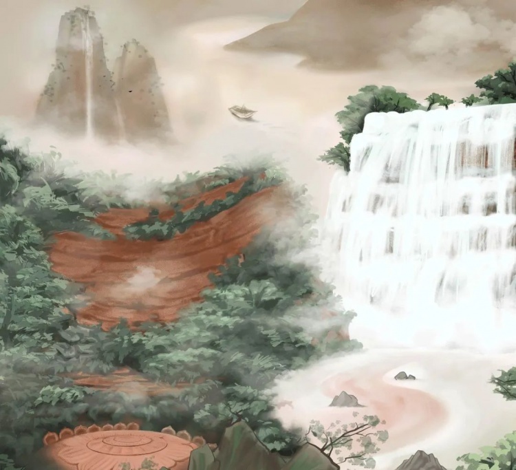 所谓数字藏品,即利用区块链技术,锚定作品生成链上唯一的所有权或使用权的数字凭证,不可篡改、不可拆分、限量发行,目的是实现作品真实可信的数字化发行、收藏和使用。“赤水丹霞”数字文创产品的设计构图运用“三远法”,融合国家5A级旅游景区——赤水丹霞旅游区的佛光岩和赤水大瀑布两大景点。佛光岩作前景,赤水大瀑布作中景,其间以云雾自然过渡,同时,背景选择较为深沉的驼色,更衬托出瀑布的雄伟气势。水景由远及近穿梭在几个场景中,增添了画面的流动性。