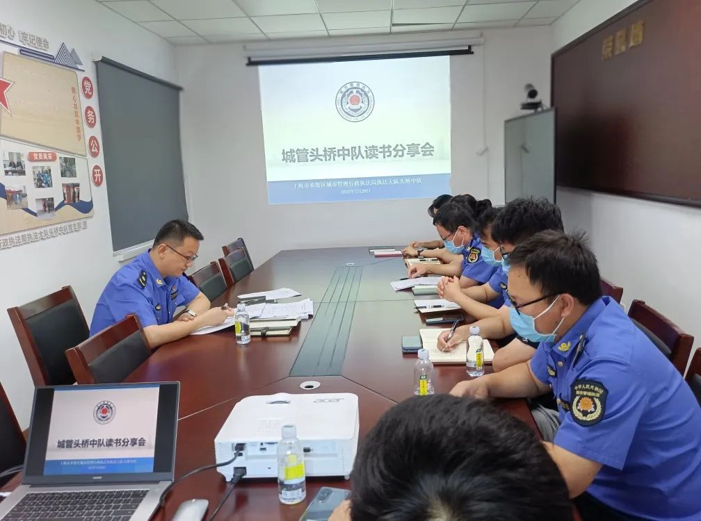 根据奉贤区局《关于开展全区城管执法系统“品读经典 强基固本”读书分享活动的通知要求》,为了激发队员们干事创业的精气神,练“内功”强本领,7月29日上午,奉贤城管头桥中队全体队员齐聚在一起,开展“品读经典 强基固本”读书分享活动,中队党支部书记兼中队长钟元主持此次读书分享会。
