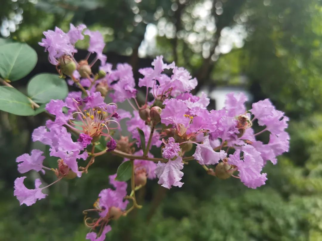 古色古香的上海大观园种植有上百株紫薇树,分布在蘅芜苑、紫菱洲、体仁沐德等处,种类有赤薇、银薇、翠薇等品种。微风中,紫薇花静静的盛开着,花瓣宛如翩翩起舞的蝴蝶,又似飞扬的少女裙裾,与仿古的亭台楼阁相互映衬,惹眼至极,走进观之,淡淡的芳香为人民在夏日燥热的天气里带来一丝愉悦和舒意。“紫薇花每年7月中旬到8月中旬是盛花期,大观园属于古典园林,古典园林种植紫薇花是点缀形式,不是成片种,在墙角、连廊等地方零散种植,与主景形成别样景致。”上海大观园工作人员王桂明说。