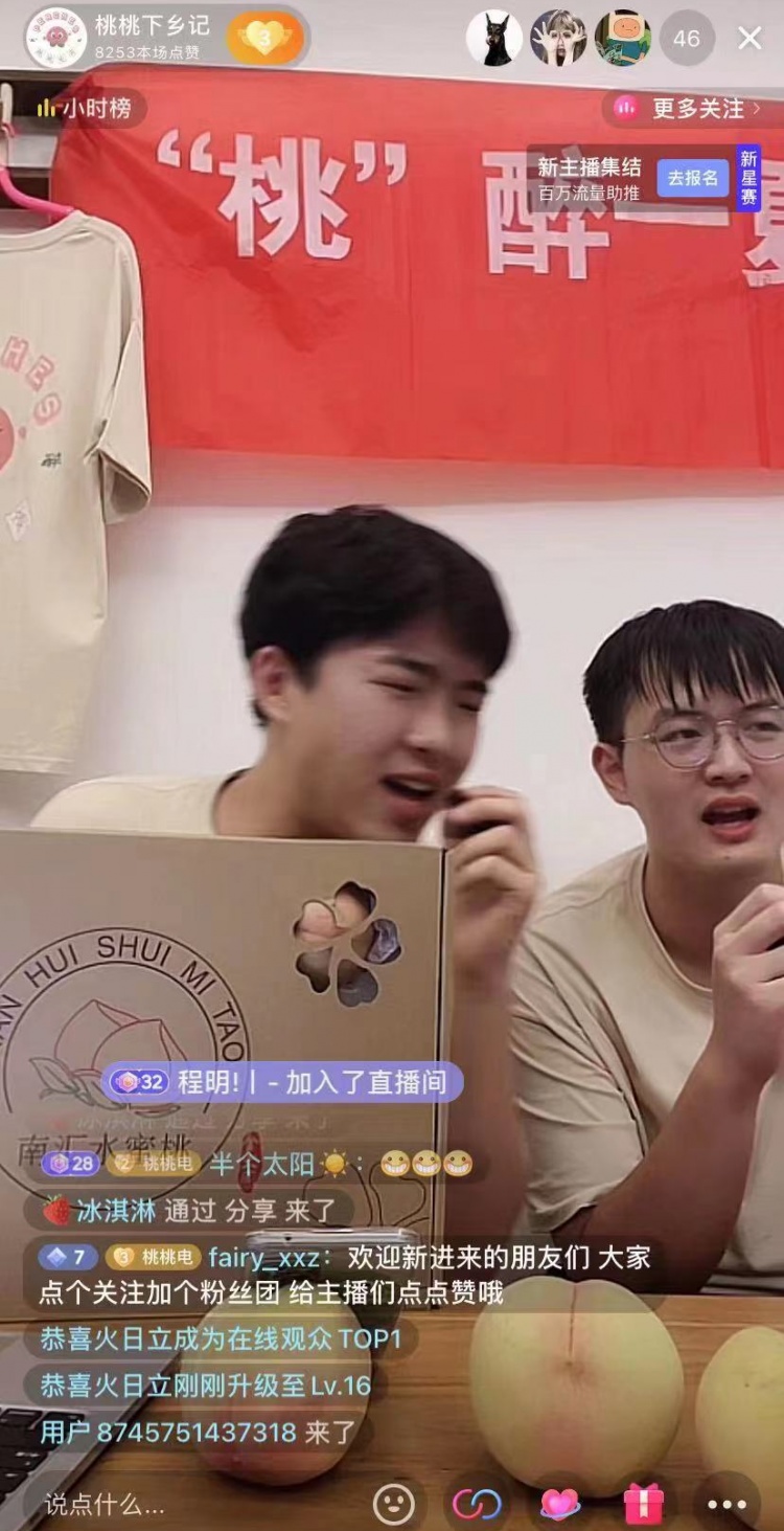 唱歌、跳舞、卖力吆喝……项目组的同学们在深入了解桃文化历史、种植常识、市场现状后,在直播说辞、策划营销策略、直播场景设置等方面做足了准备。直播开启后,“带货主播们”如数家珍般介绍蜜露桃的生长情况,讲述一颗蜜露桃背后的生长故事,玩起了在线花样试吃,还又唱又跳进行才艺表演,可谓拿出十八般武艺,为打响大团水蜜桃品牌贡献青春之力。