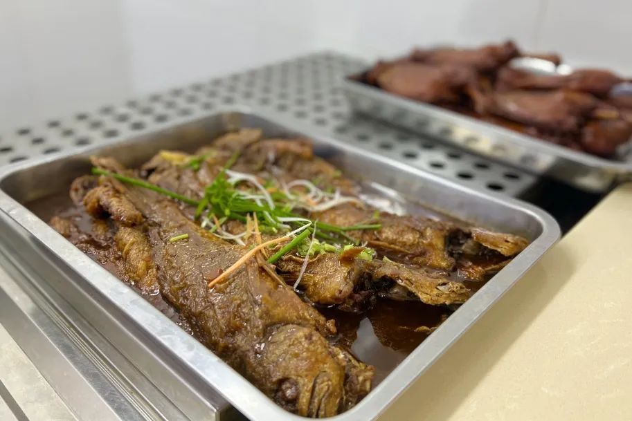 熟练的颠勺技术,紧接着调味上色......每天上午九点,后厨师傅们就开始了一天的忙碌。他们先把每份菜品的食材洗好、切好,再用大锅开始翻炒,动作麻利。整个过程中,两位厨师均佩戴N95口罩,穿着专用服装和帽子,保证烹饪过程的干净卫生。