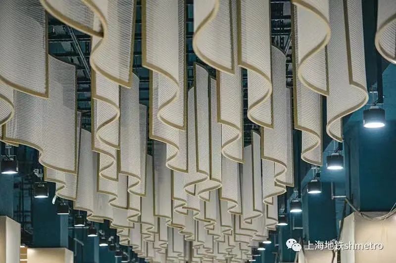 地铁站厅里波浪造型的立体吊顶,正好呼应长风公园地名的由来:“愿乘长风破万里浪”。吊顶宛如蜿蜒流动的河水,动感十足。