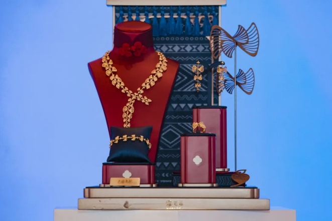 老字号珠宝品牌老庙在日前举办的第二届中国国际消费品博览会上首发创新经典新品“有鹊”系列黄金首饰。8月1日-7日,老庙新世界城店呈现三大设计师款饰品,通过强阵