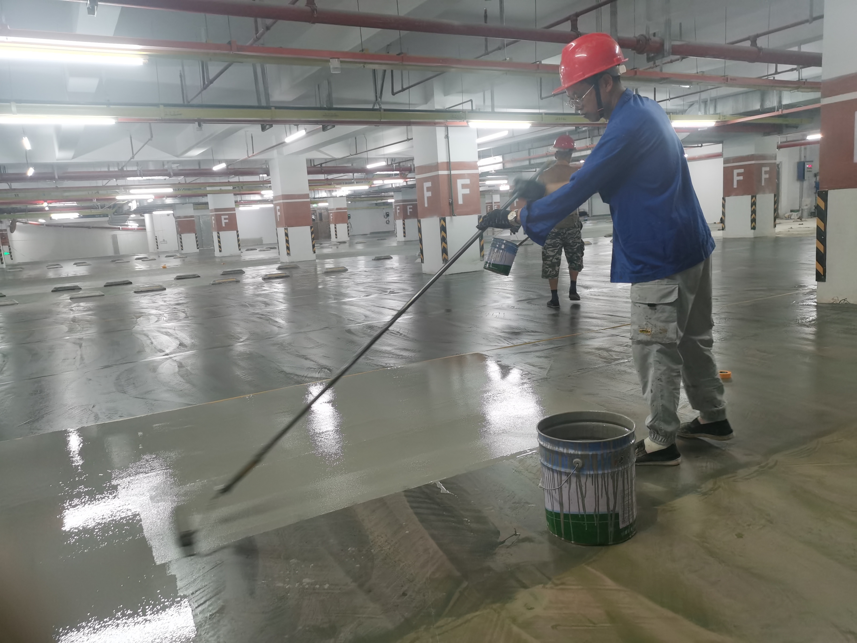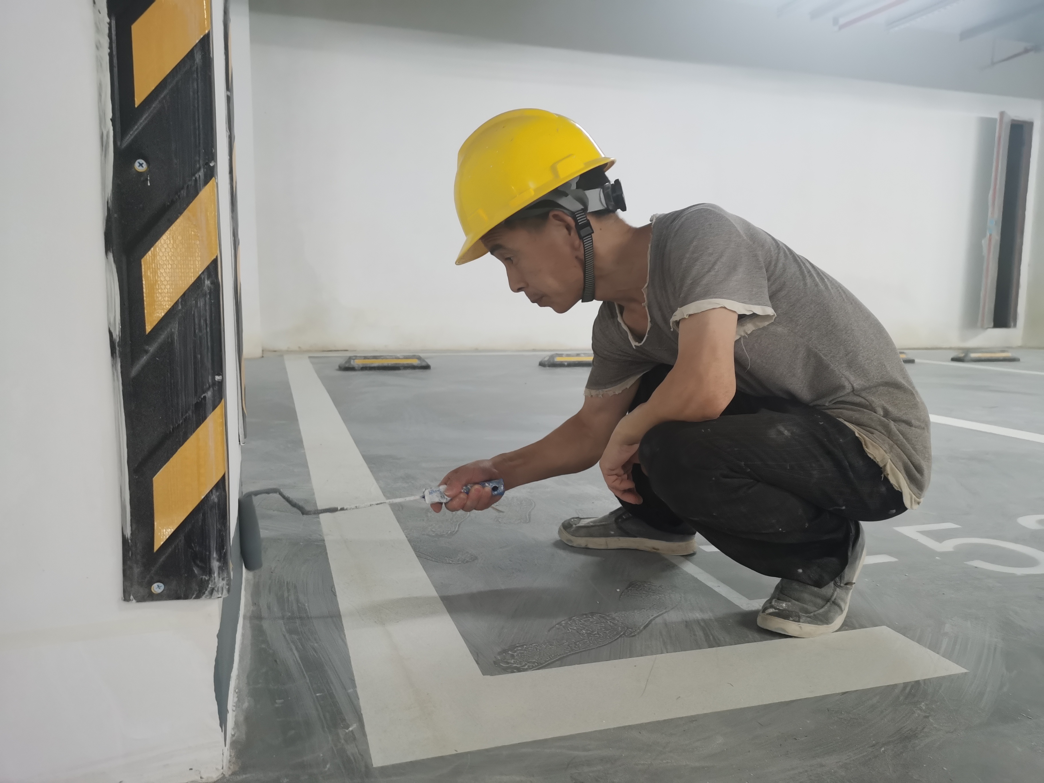 在地下室4层,正在涂刷环氧地坪的涂料工李师傅背后的衣服湿透大半,脸上也挂满了汗珠。为了保证涂刷面的平整清洁、美观无接缝,同时又要保证在材料胶水化之前被涂刷完,他正甩开臂膀,奋力用滚筒来回涂刷。