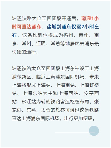 近日,沪通铁路太仓至四团段进入全线开工建设阶段,该工程北起沪苏通铁路太仓站,南接上海市浦东铁路四团站,途经江苏省苏州市所辖的太仓市及上海市嘉定区、宝山区、浦东新区和奉贤区。