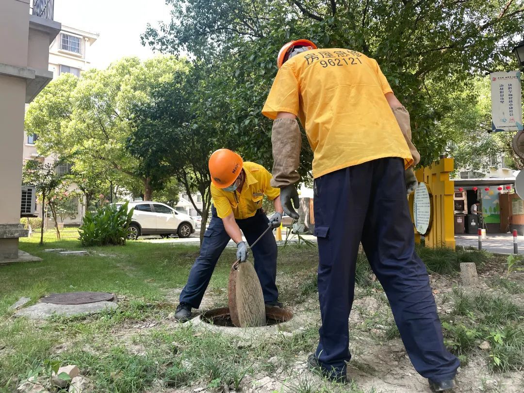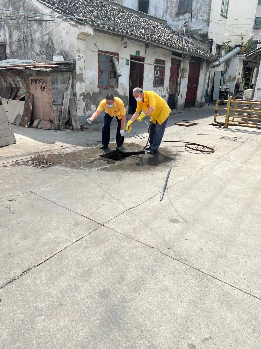 松江区房屋维修应急中心维修人员正在疏通窨井