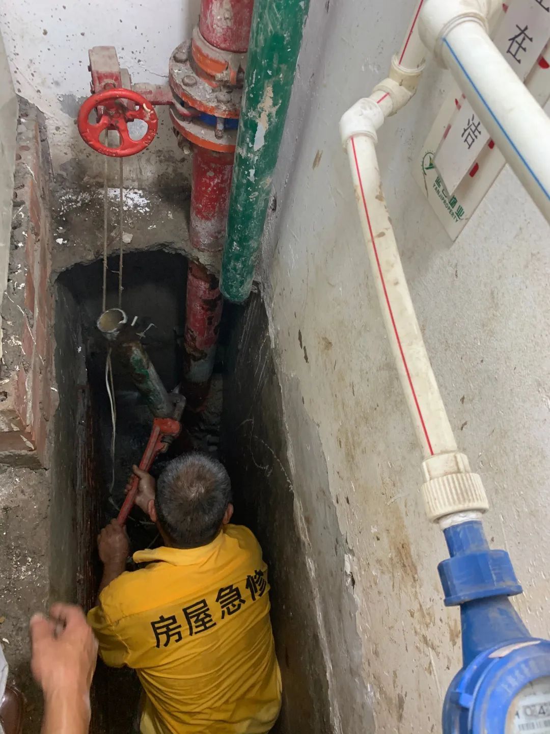 杨浦区房屋维修应急中心维修人员正在夜间抢修水管
