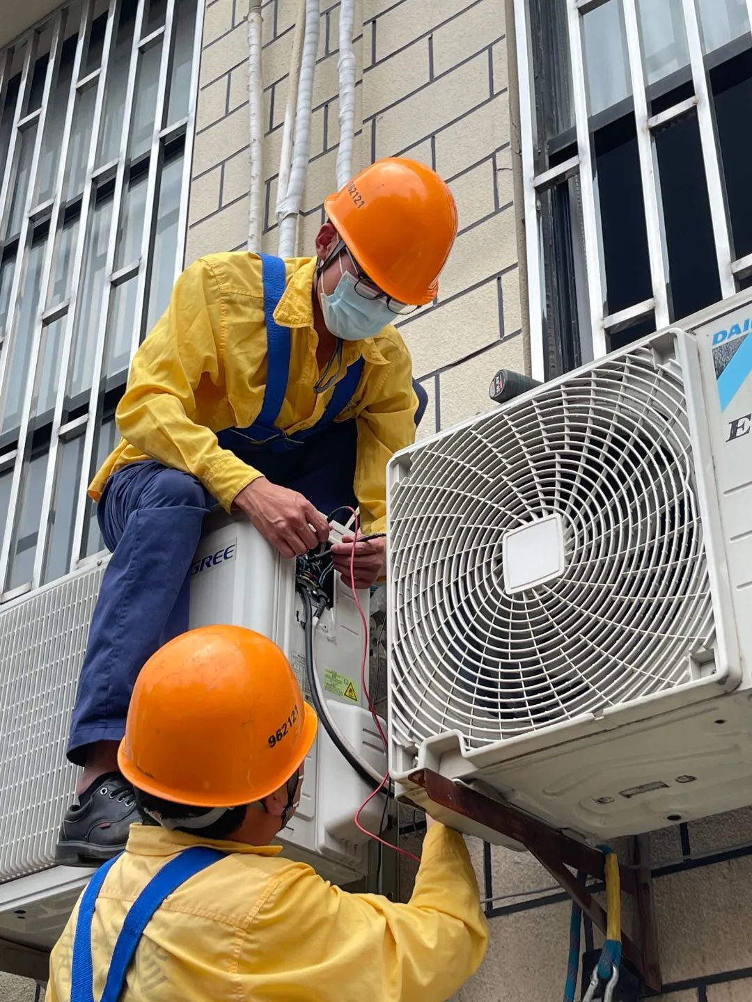 普陀区房屋维修应急中心维修人员正在检修空调外机