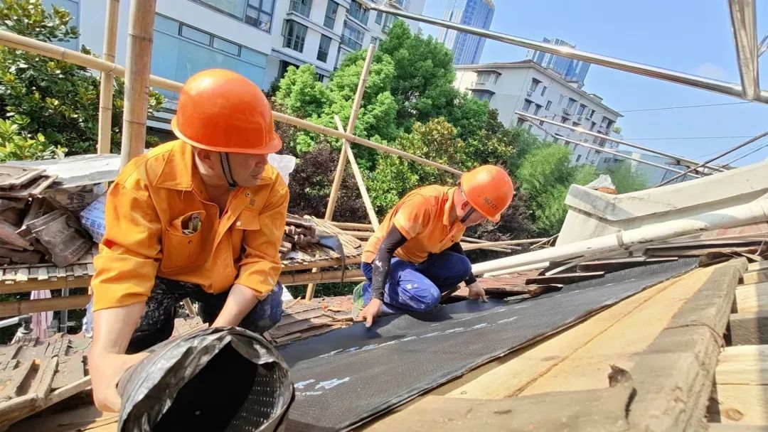 徐汇区房屋维修应急中心维修人员正在铺设防水层