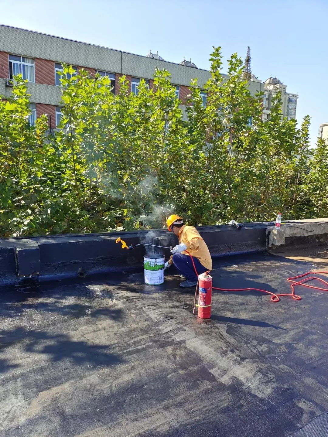 徐汇区房屋维修应急中心的维修师傅们为做好小区屋顶的防水层工作,往往早上6点多便开工了。空荡荡的屋顶上毫无遮拦,在太阳的炙烤下,连屋顶的砖瓦都变得十分烫手。当维修师傅用火枪对刚铺上的新沥青防水卷材进行加热时,火花四溅,屋顶瞬间形成一层热浪。即便如此,维修师傅们分工明确,一人铺设防水卷材,一人加热烘干材料,还有一人要拉住安全绳,保障靠近房顶外沿作业工人的安全,很快崭新的屋面已铺好,以顺利挺过台风天。