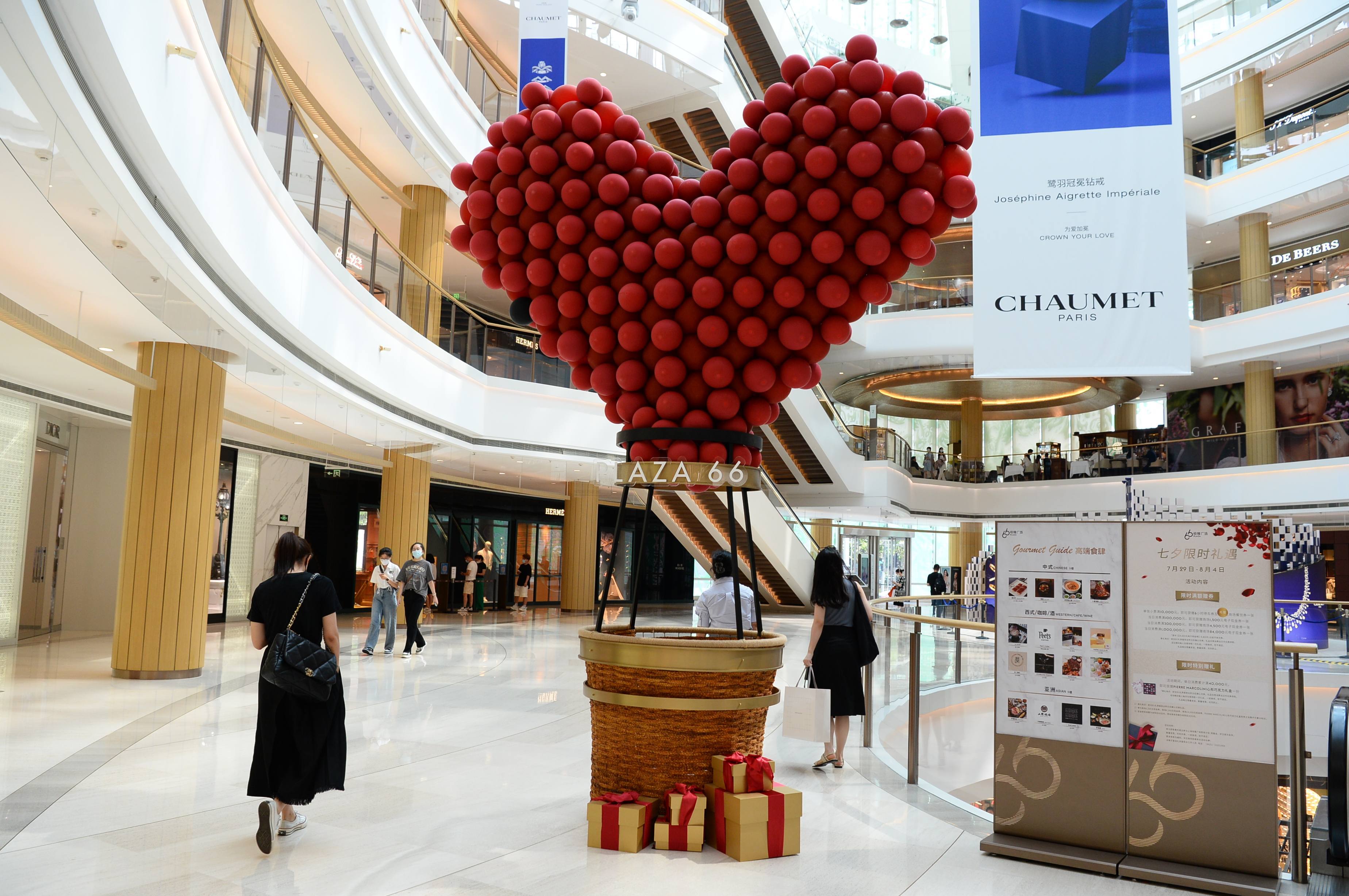 爱心热气球、花海花车、限时快闪……记者在上海恒隆广场看到,多彩缤纷的各式七夕活动装置吸引了不少人拍照打卡。