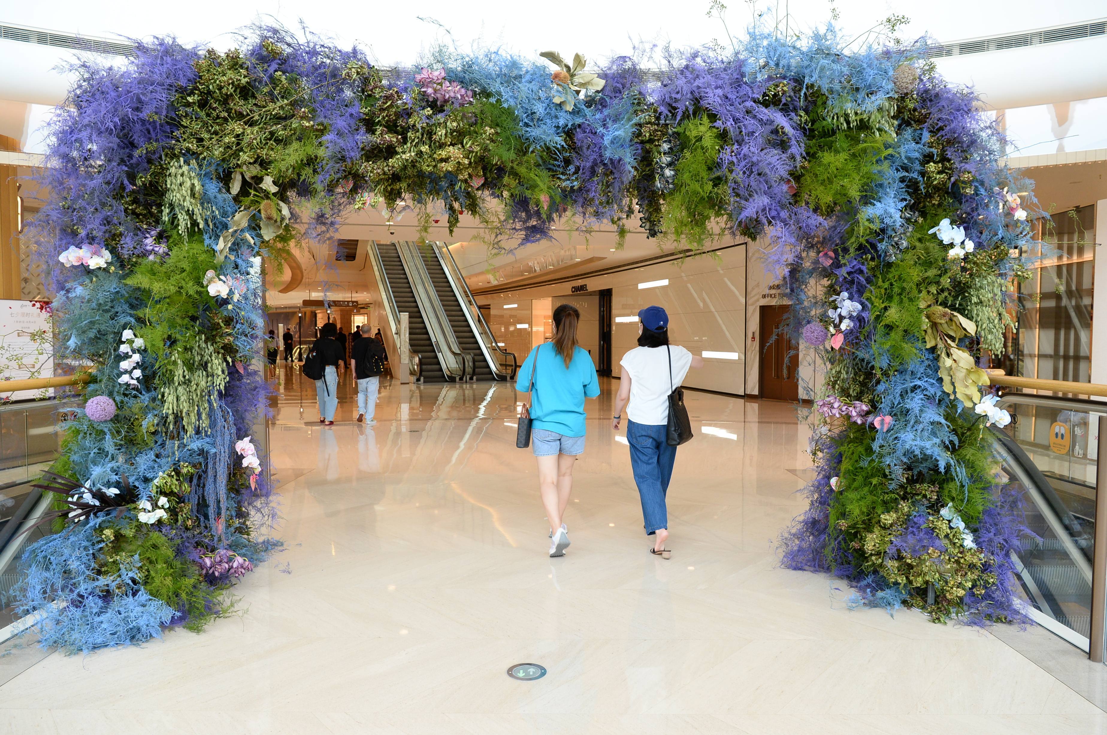 集花艺、饮品、下午茶为一体的花艺美学品牌La Moda,于商场东广场入口处打造七夕创意花型拱门,以多彩鲜花作为装饰,让踏入商场的宾客仿佛沉浸群芳盛放的绚丽花海。