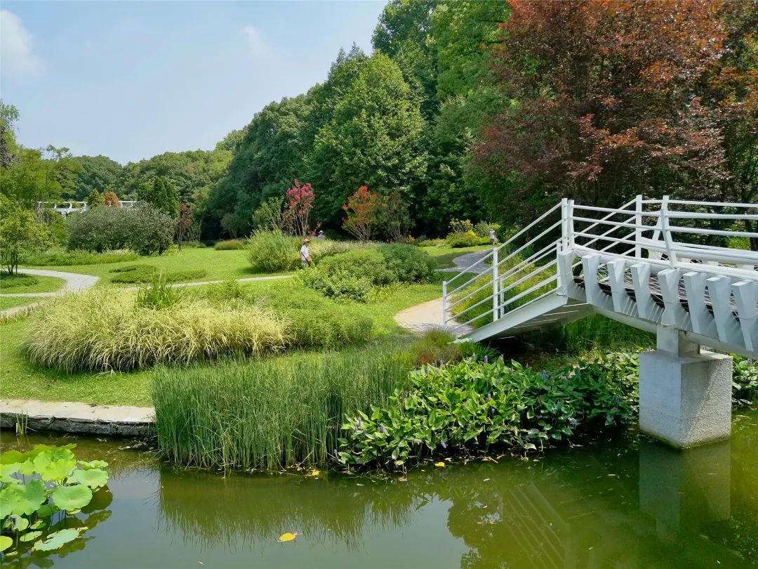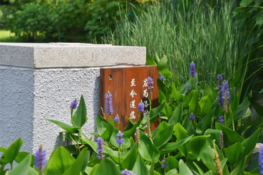 区域内水体景观方面,沉水植物种植以矮生苦草为主。岸边搭配各类挺水植物,有旱伞草、灯芯草、梭鱼草、千屈菜、花叶水葱等,前中后景层次丰富。夏天站在U型栈桥望去,荷花亭亭玉立,睡莲绚丽多彩,各类水生植物错落有致一幅轻盈灵动、夏日缤纷的美丽画卷映入眼帘。