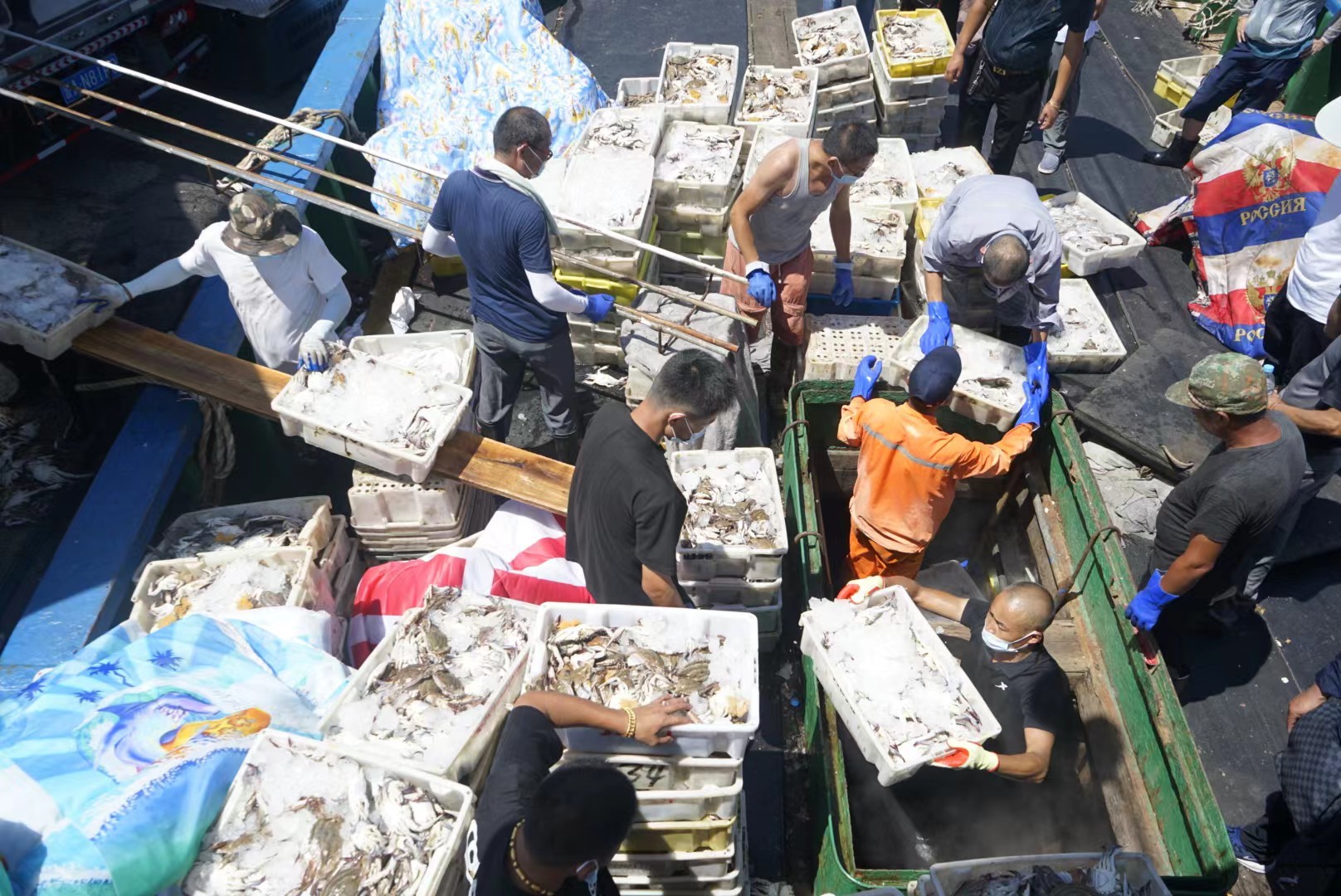 另一边,等候进货的批发商也不少,现场一箱箱梭子蟹接连不断地被运走,空气里弥漫着海鲜味。