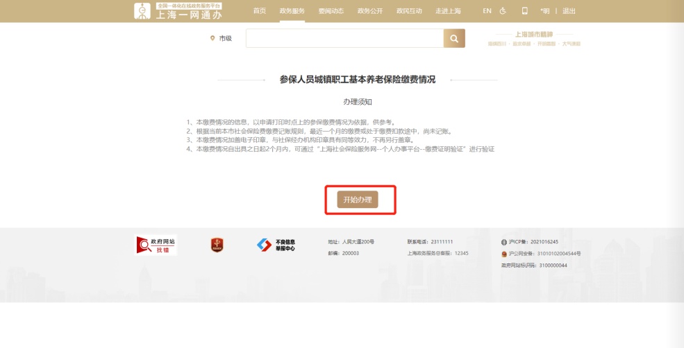登录“一网通办”平台(网址:https://zwdt.sh.gov.cn/govPortals/index.do),在搜索栏输入“参保人员城镇职工基本养老保险缴费情况”,点击“开始办理”。