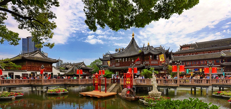 如今,豫园商城已成为魔都的国潮地标之一。情侣们走一走豫园商城内的九曲桥,平安又喜顺,还有荷花池中的锦鲤为爱加持。