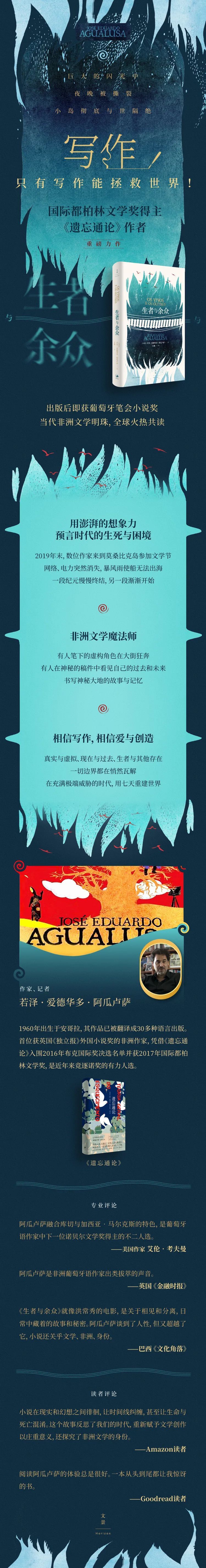《生者与余众》是阿瓜卢萨继获得国际都柏林文学奖的《遗忘通论》后最重要的作品,甫一推出便获得了2021年度葡萄牙笔会小说奖,在这个故事中,生与死、过去与未来、现实与虚构的界限不复存在,人们在绝境中探索,也在废墟上创造。