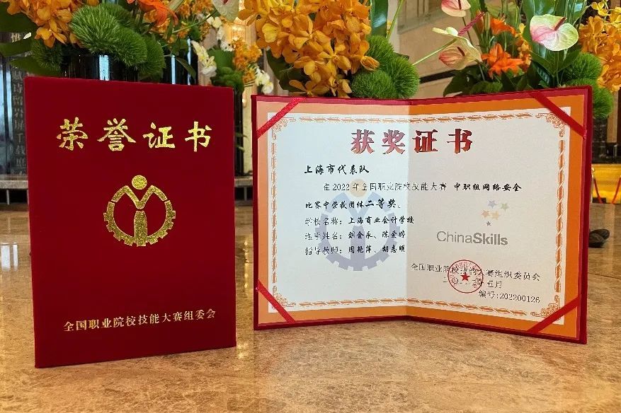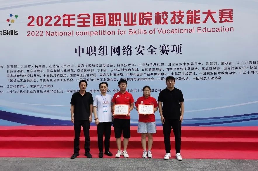 7月30日—31日,为期两天的2022年全国职业院校技能大赛(中职组)“网络安全”赛项在江苏南京商业学校举行,共有来自全国各省、市、自治区的63支代表队一百余名选手参赛。上海商业会计学校中高贯通网络信息安全专业19级刘金永和20级陈爱婷两位选手代表学校参赛,同时陈爱婷同学也是学校历届首位参加此项国赛的女选手。在两天的激烈角逐中,两位选手沉着面对,表现出色,从63支队伍中脱颖而出,最终夺得团体二等奖的好成绩,这也是上海商业会计学校连续第5年在“网络安全”国赛上获奖,为学校网安国赛征程续写新篇章。学校高度重视此次比赛,副校长范荣、信艺教学部主任周艳萍、两位指导教师胡志明、陈冠奇全程陪赛,做好学生比赛期间的保障工作。