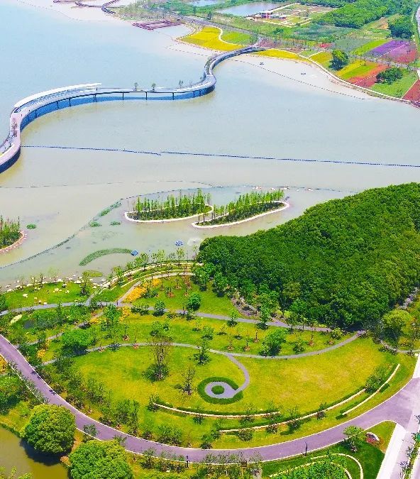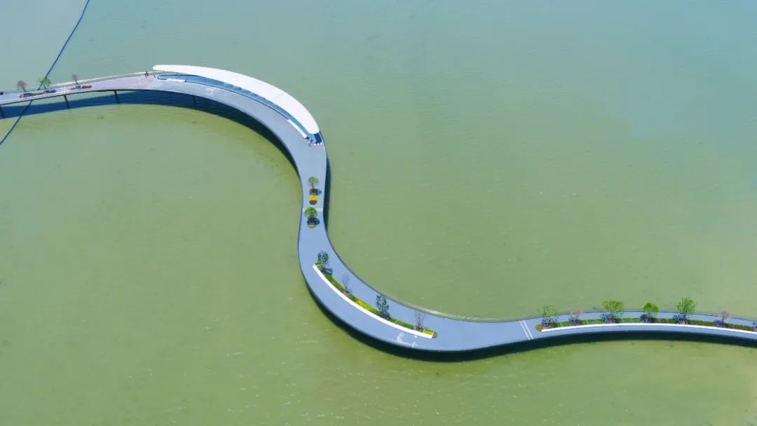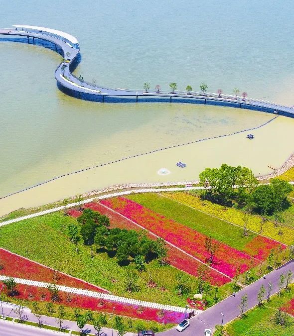 从空中望去,元荡慢行桥宛若一条的彩缎,横跨沪苏两地,飞卧在元荡湖上。元荡慢行桥全长586米,整体设计以“同心结”为理念。和心爱之人漫步这座桥,寓意也是十分美好。