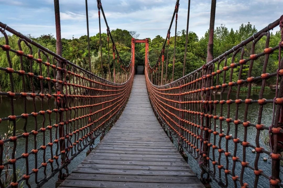 吴淞炮台湾国家湿地公园保留了长江滩湿地的原生态自然风貌。里面藏着一座网红吊桥,砖红色的桥体在绿叶的映衬下很好看。