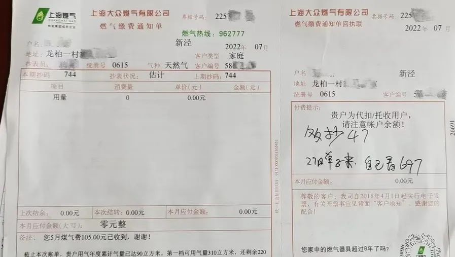 有市民称,其5月的燃气费高达1300元,而前一次账单才不到100元,“简直是抢钱式的估算。”家住浦东的王女士也表示,疫情期间自家的空置房竟被估出300元的燃气费,后多次致电962777,燃气公司才将其账单取消。