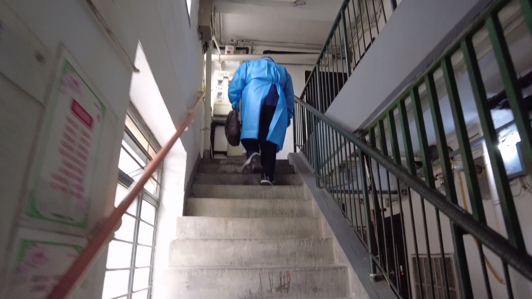 扫好场所码,身材有点微胖的阿亮医生,一步一步登上五层楼高的台阶。第一家是90岁的刘阿婆,她与60多岁患类风湿关节炎的女儿行动都不太方便。做了抗原检测之后,阿亮便咨询了老人最近的身体状况,老人患有骨质疏松,阿亮说,高龄老人最忌讳摔倒骨折,阿亮再三叮嘱老人,大热天要多喝水,注意开窗通风,空调还是要适时开一开的。