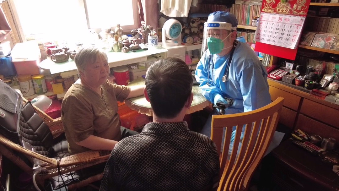 阿亮医生在帮老人开好处方,配好药后,又顶着高温,继续前往下一个病人顾阿婆家。