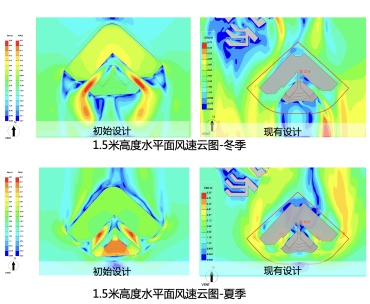 通过室外风环境优化设计,微调建筑形体及布局,保证1.5m处行人可感知风环境区域的人体舒适度。
