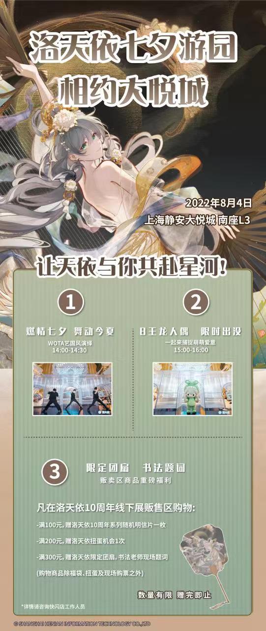 8月4日,静安大悦城在南座L3中庭推出“洛天依七夕游园”专场,三重惊喜等你来: “WOTA艺国风演绎”表演、8王龙人偶限时出没打卡、还有书法老师现场题词的洛天依限定团扇等周边出售。