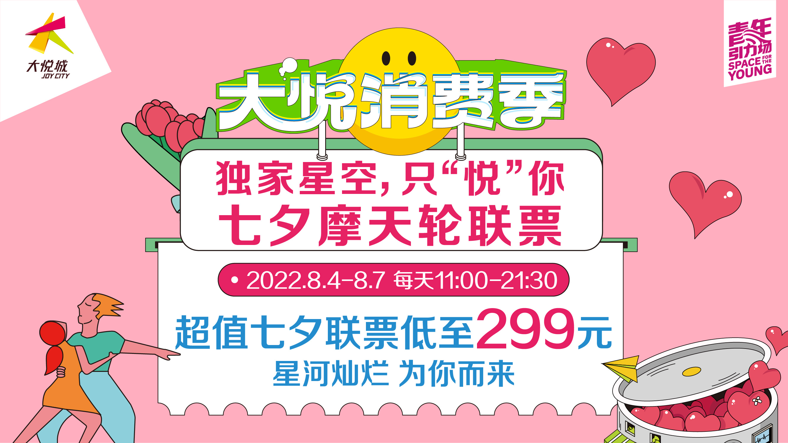 8月4日至8月7日,静安大悦城推出七夕专属摩天轮联票,价值405元情侣包舱联票,仅需299元即可秒杀。包含三大权益:“摩天轮情侣双人包舱乘坐1圈、浪漫花束伴手礼、甜品”。